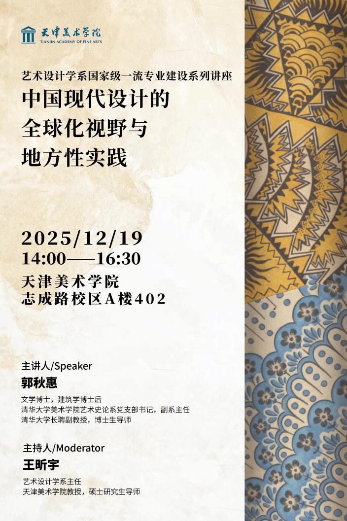 2025 年 12 月 19 日下午,天津美术学院志成路校区A楼402报告厅举办设计艺术学院艺术设计学系国家级一流专业建设系列学术讲座,主题为 《中国现代设计的全球化视野与地方性实践》。本次讲座由清华大学美术学院长聘副教授、博士生导师,艺术史论系副主任,中国设计学研究所副所长郭秋惠博士主讲。郭秋惠老师长期从事中国近现代设计史论与工艺美术史论研究,曾主持国家社会科学基金艺术学一般项目两项,参与国家社科基金重大招标项目子课题一项,发表学术论文六十余篇,出版学术著述二十种,并多次策划兼具学术深度与社会影响力的重要展览。本次讲座中,郭秋惠老师从全球化视野与地方性实践两个互为张力的维度出发,以 20 世纪上半叶中国现代设计的发展为主要考察对象,通过一系列群体性案例,系统梳理了中国现代设计在观念生成、知识移植与实践转化中的历史逻辑与内在结构。