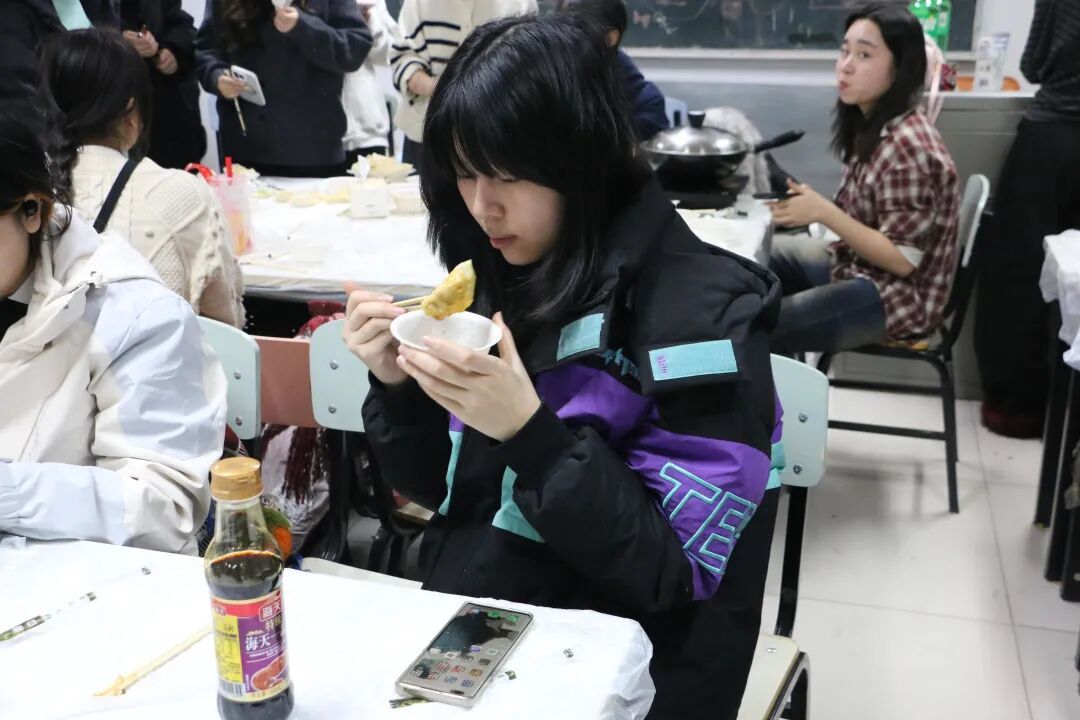 当第一锅热气腾腾的饺子出锅,香气瞬间弥漫整个教室。同学们捧着自己亲手包的饺子,趁热品尝,皮薄馅足的口感让大家赞不绝口。有人分享包饺子的小技巧,有人交流家乡的冬至习俗,原本陌生的同学在协作中渐渐熟悉,熟悉的伙伴在分享中升温,每一个饺子都包裹着同窗情谊,每一口饺子都承载着集体温暖。