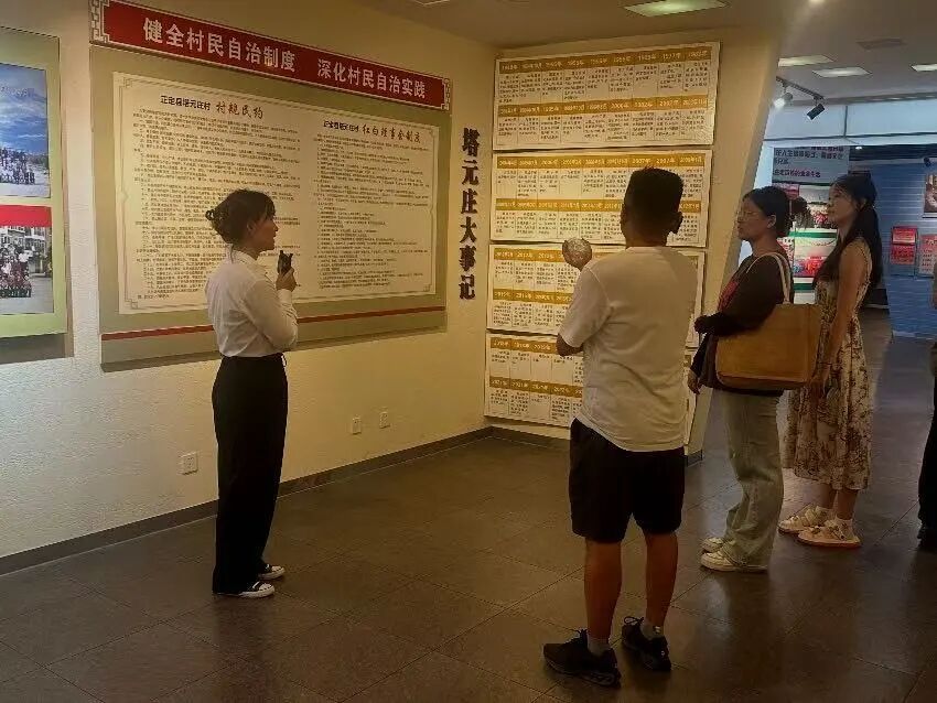 成员们走进村史馆在讲解员的细致介绍下,了解了这个村庄从过往旧村落向富裕美丽新农村的华丽蜕变历程。亲眼见证了这个村庄从过往旧村落向富裕美丽新农村的华丽蜕变,细致聆听了村庄在党的坚强领导下,探索乡村振兴发展之路的生动故事,每一个变化都彰显着改革创新的魄力与实干奋斗 的成果,让成员们深刻感受到基层治理中党的引领力与群众的创造力所凝聚的强大能量。