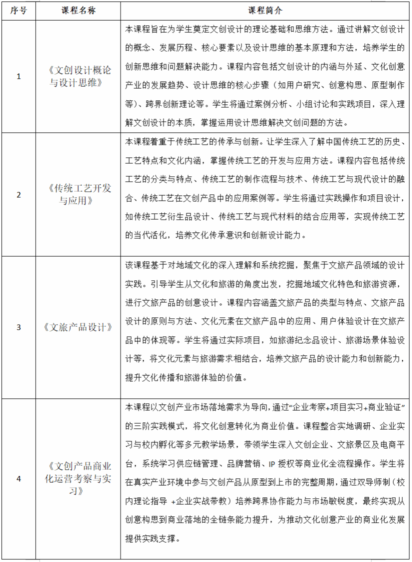 课程设置方面:构建核心课程体系,涵盖文化创意产业概论、传统文化元素挖掘与应用、创意设计思维训练、文创产品设计实践、商业策划与市场营销,兼顾理论认知与实战能力培养。