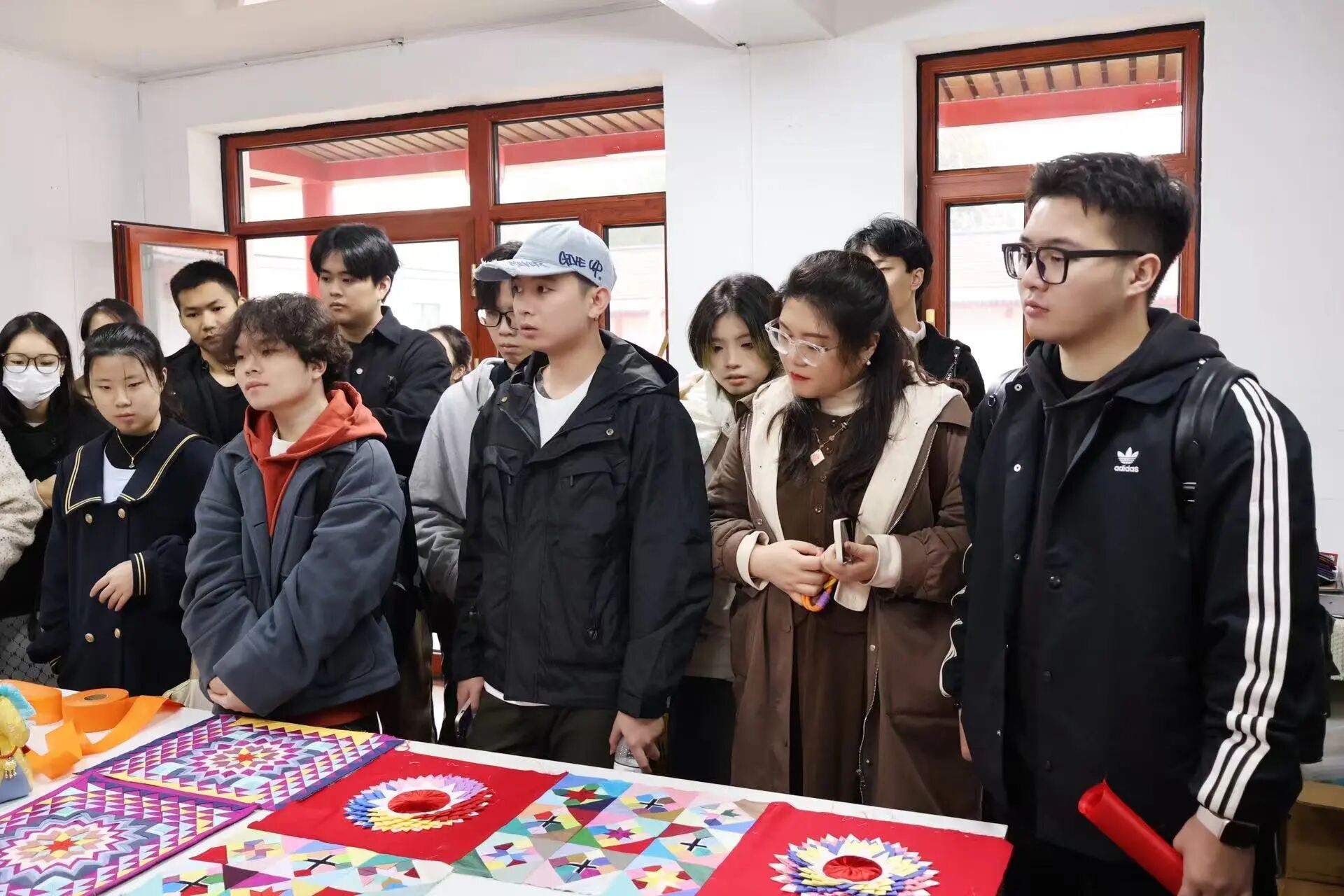 在织布机展示环节,缂丝机与土家族织布机的技艺对话令人印象深刻。缂丝机“经线不断纬线断”的工艺特性,成就了龙袍凤袍的复杂图案;土家族织布机则保留了老粗布的质朴肌理,两种技艺的碰撞让跨校学子感受到传统工艺的多元魅力。钱俊如老师现场演示了折角技艺,展现出平面拼布走向立体构成的造型突破,其中蕴含的藏针法与“一针一心一意”祝福口诀,让技艺传承升华为精神修行,也让两地学子对传统工艺的精神内核有了更深理解。