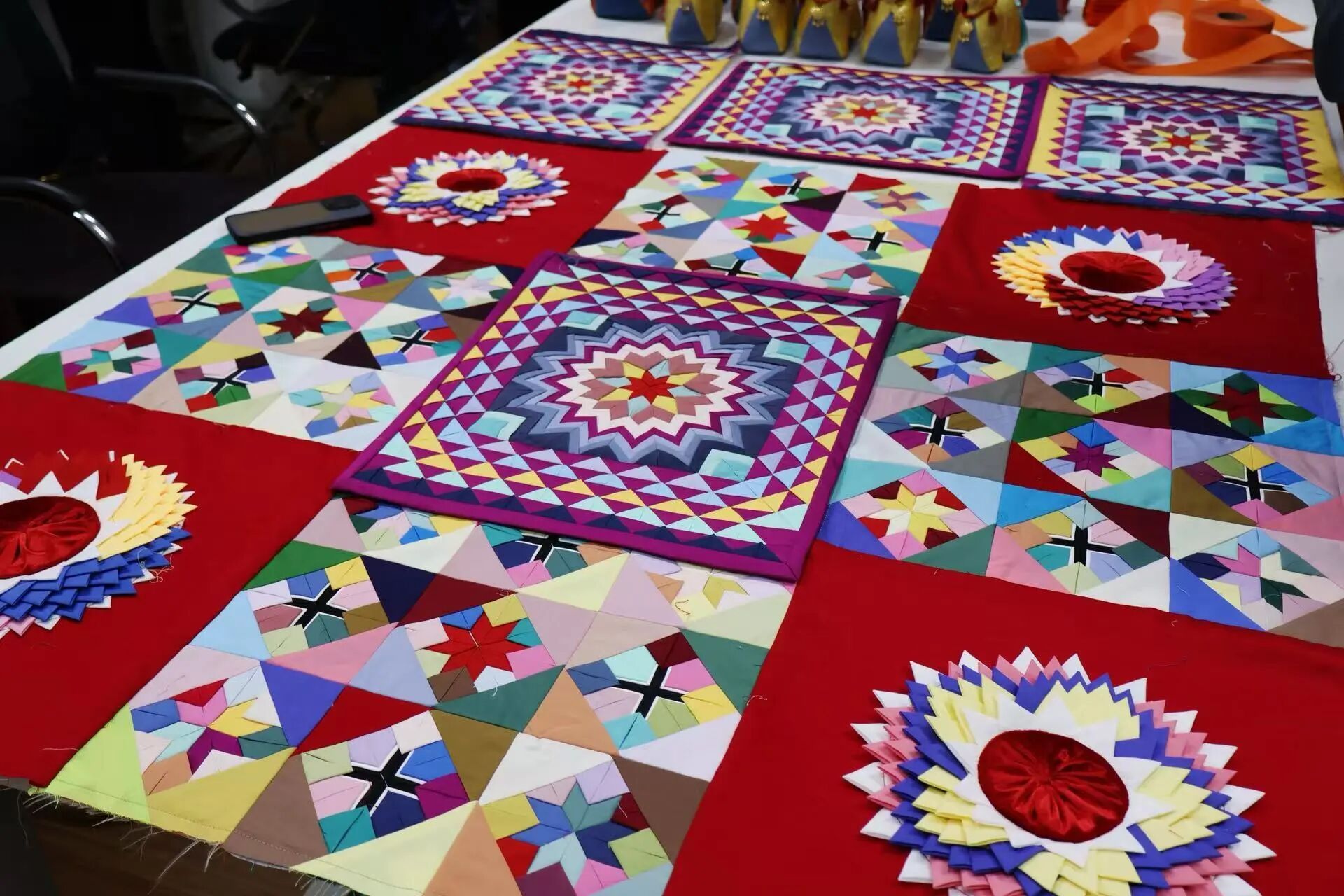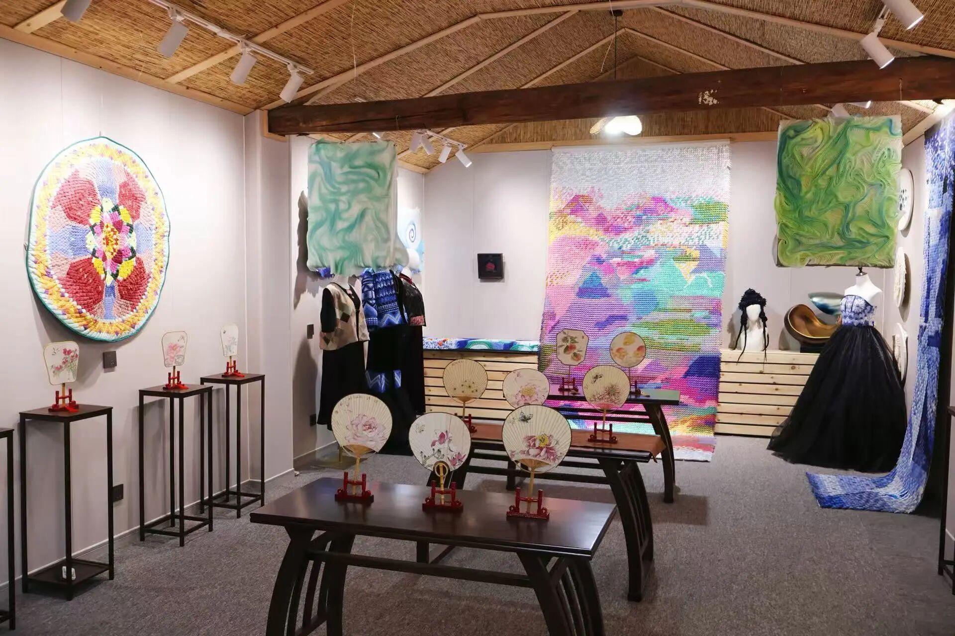 工坊内陈列的当代百纳拼布作品,成为传统与现代对话的生动样本。这些作品在延续传统拼布视觉逻辑的基础上,大胆解构民族图案的色彩关系与构成法则,从古法蓝染到云锦再现,从绫罗绸缎的天然透气到拼布折角的空间再造,每一件作品都在搭建传统工艺与当代视觉经验的沟通桥梁,为学子们提供了非遗创新的直观参考。