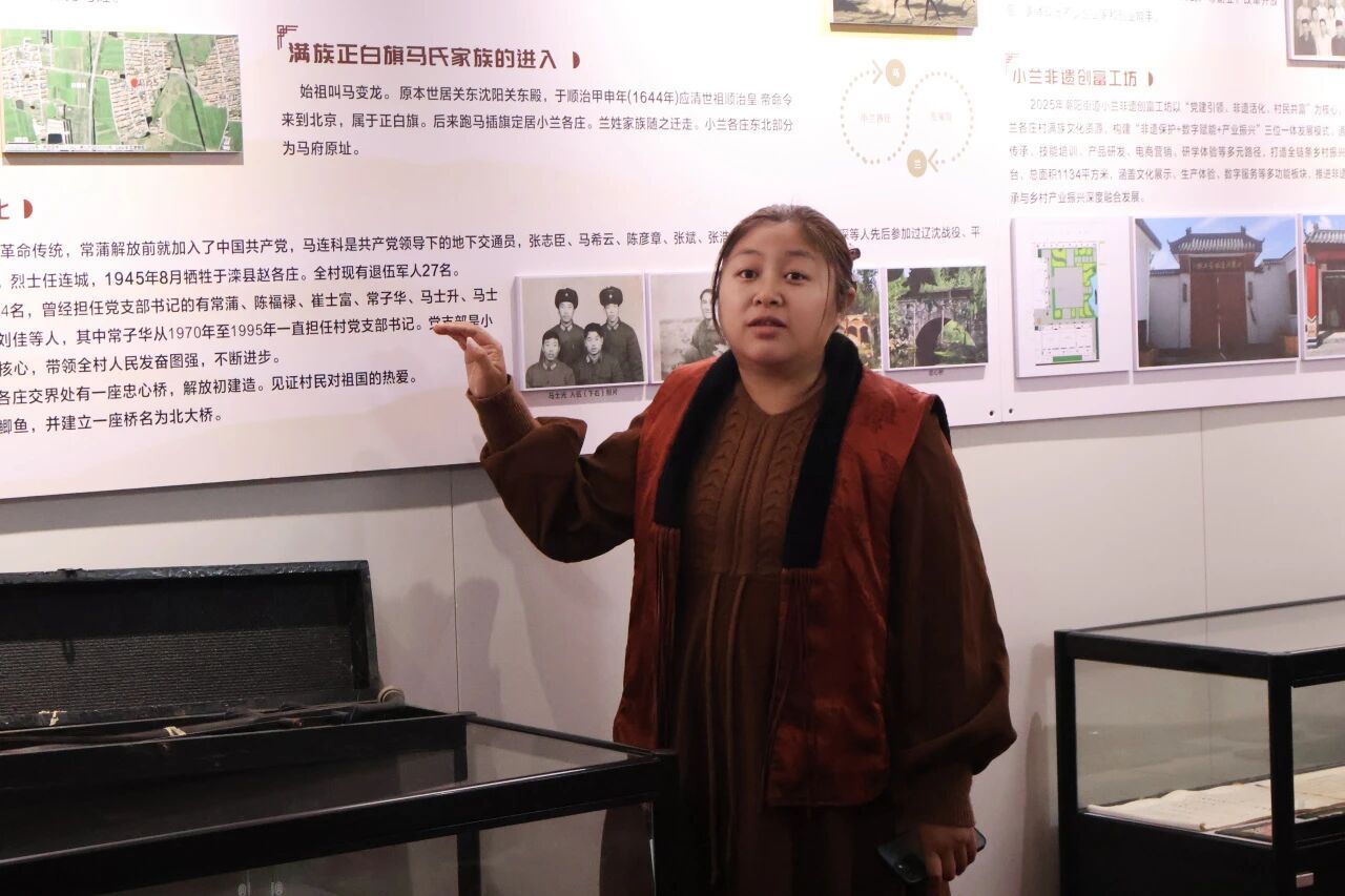 考察从工坊入口的射箭流程图启程,满族骑射文化通过图形符号完成了从历史记忆到空间叙事的转换,巧妙呼应了八旗制度的历史脉络,形成独特的视觉隐喻。钱俊如老师以地理空间为基底,将小兰各庄的红色文化、八旗氏族迁徙史与经济民主进程串联起来,构建成一部立体的地方文化图志,而百纳拼布正是串联起物质与非物质文化的核心视觉符号。