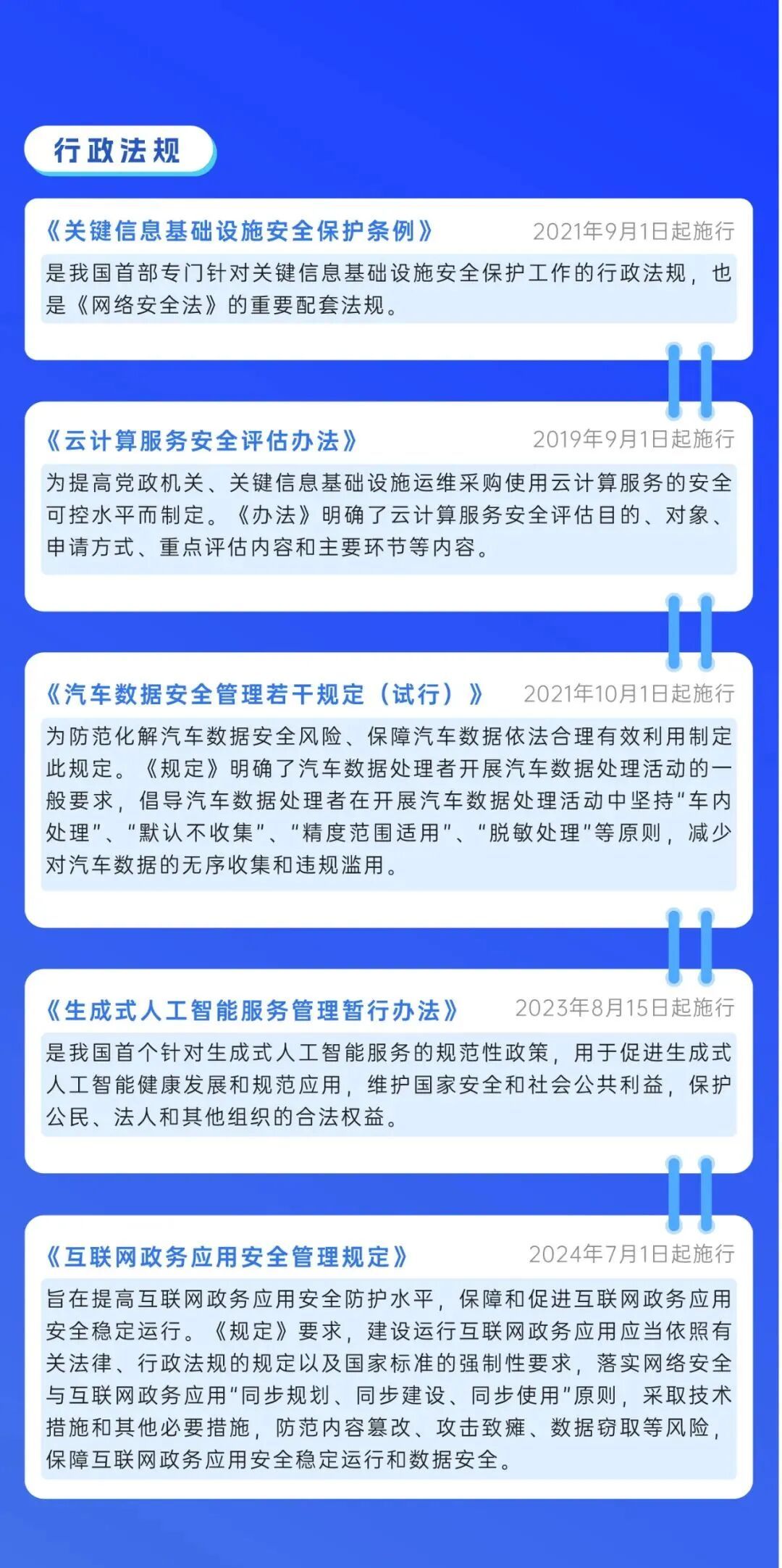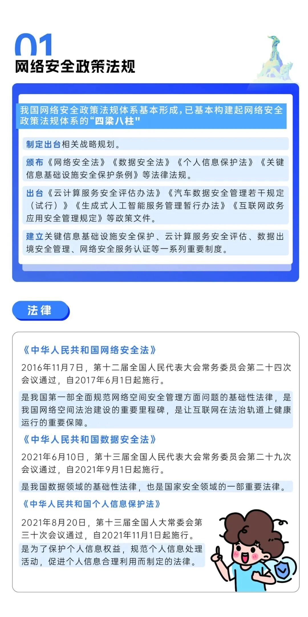 (二)深入宣传《中华人民共和国网络安全法》《中华人民共和国数据安全法》《中华人民共和国个人信息保护法》《关键信息基础设施安全保护条例》《网络数据安全管理条例》《互联网政务应用安全管理规定》以及人工智能安全、汽车数据安全等领域等重要法律法规、政策文件、国家标准,创新宣传方式,面向公众开展多层次普法教育活动。